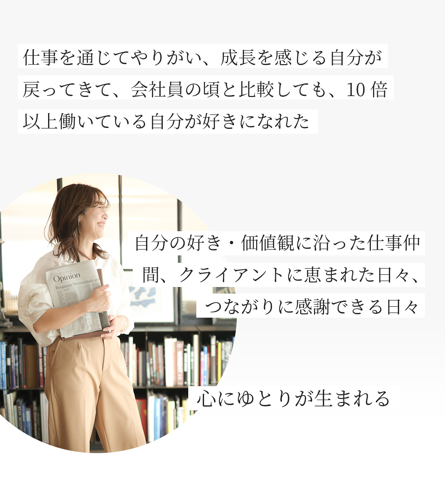 そんな中でみつけた、自分でビジネスを創り上げるという手段。この選択肢を見つけた時には、将来に光が差したような、働き方の可能性は無限に広がるような、そんな気持ちで自分の将来の生き方を描けるようになりました。